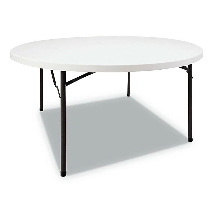 Convenient round folding tables setup quick for banquets, dinner or when just extra space is needed. Tables are perfect for both indoors or outdoors. Blow-molded polyethylene top is water and stain resistant; won’t crack or stain. Strong durable powder-coated metal construction withstands dents and scratches. Slide lock feature to ensure table stability once opened. Legs fold flush into table creating a flat surface for storage and stacking. Non-marring foot caps. Supports up to 1200 lbs (evenly distributed).