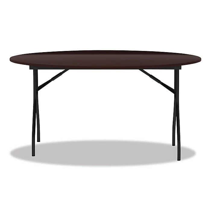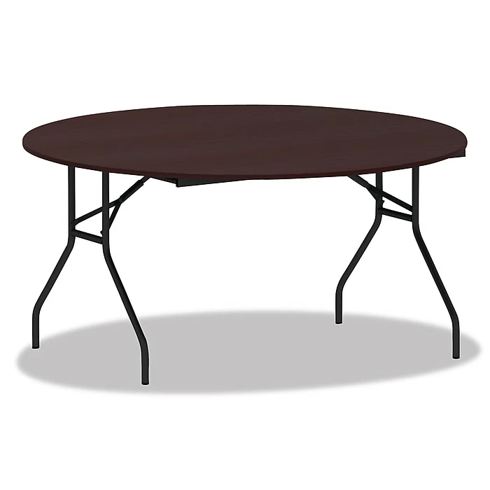 Scratch-resistant melamine top is 5/8″ thick with a one-piece, steel apron and vinyl edging. Gravity leg-locking mechanism makes set-up quick and easy. Folds to 2 1/2″ thick and locks for easy transport and storage. 1″ diameter, steel legs have plastic foot caps to protect floors. Holds up to 1,200 lbs evenly distributed.