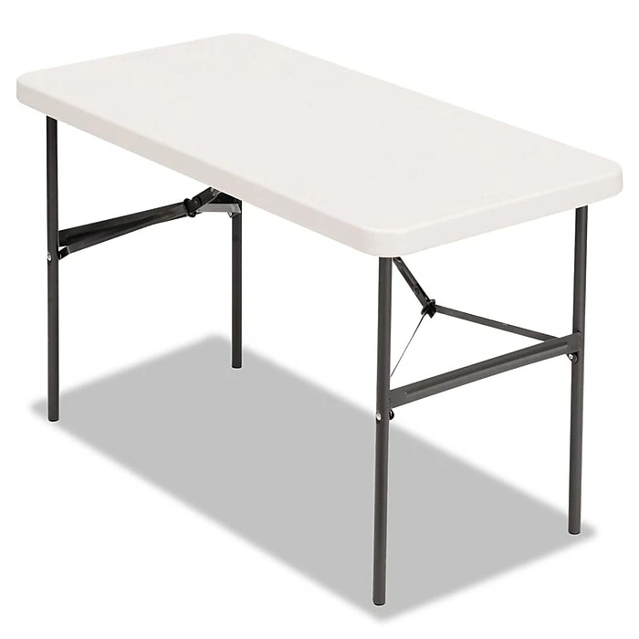 United Stationers® 29″ Banquet folding table in platinum/charcoal color is made of blow molded high density polyethylene top to resist scratch/dent/water. Table has heavy gauge, powder coated round legs for additional strength.