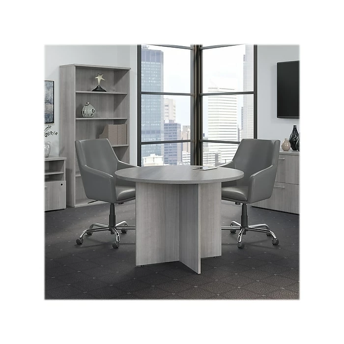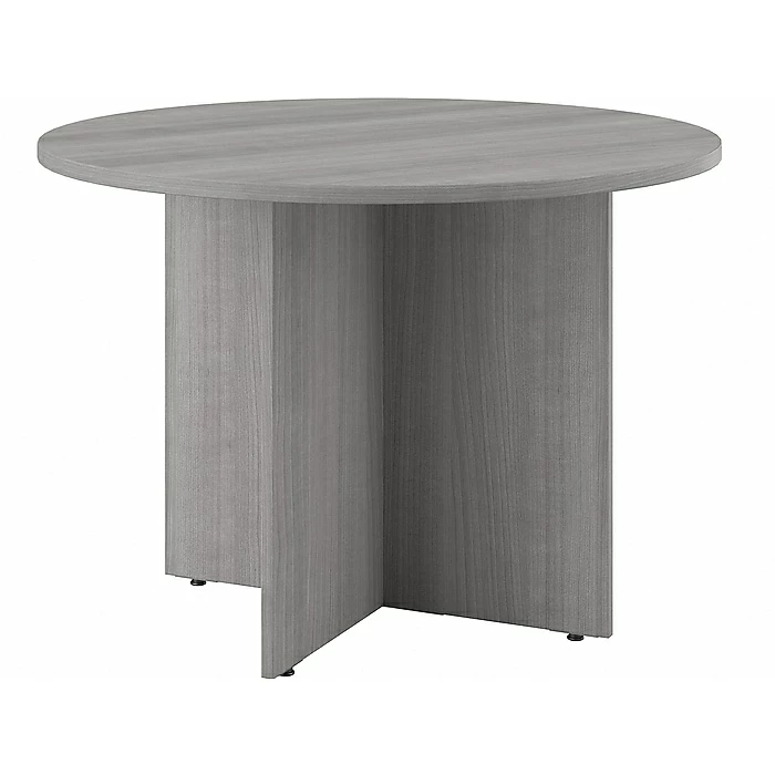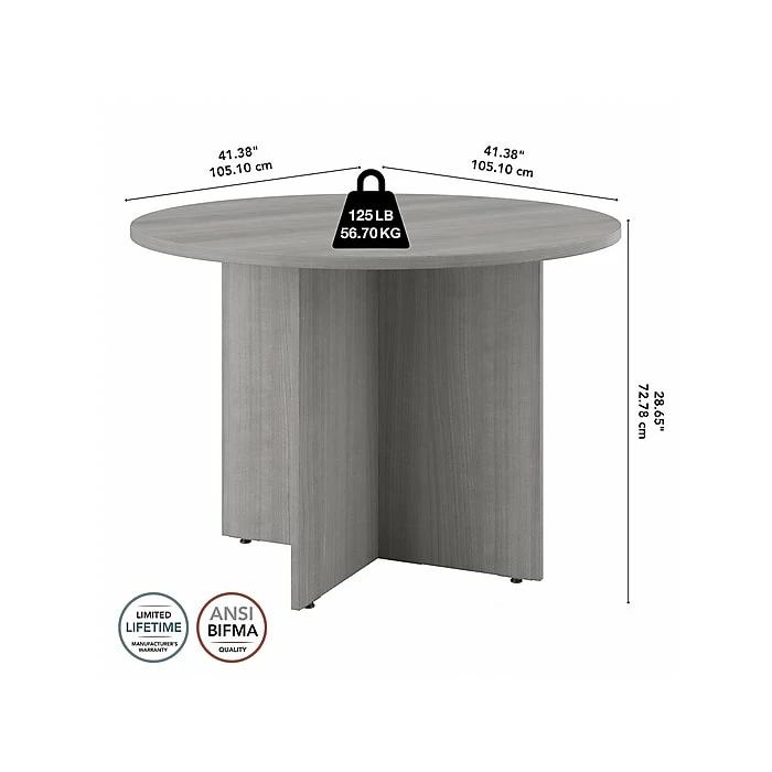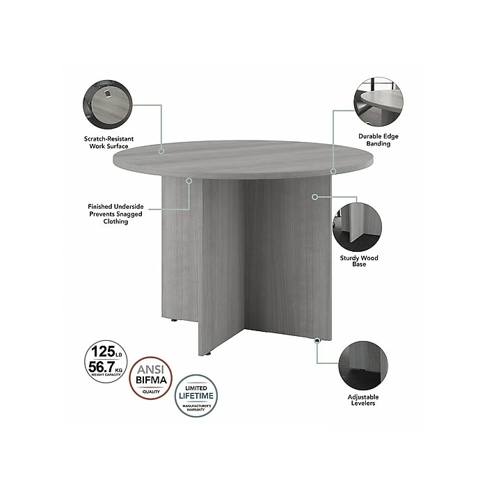 Bring your team together in a private or open plan office with the Bush Business Furniture 42W Round Conference Table. At just the right size, this small meeting table provides ample room for up to 4 users to collaborate with laptops, paperwork and other materials without taking up too much floor space. A durable thermally fused laminate work surface with continuous edge banding protects against scratches, stains, nicks and dings throughout years of daily meetings while a finished underside helps prevent snagged clothing. The conference room table is supported by a sturdy wooden base for a weight capacity of 125 pounds, making it great for use in a variety of professional and educational settings. This small office table is tested to meet ANSI/BIFMA quality standards for safety and performance and is backed by a Limited Lifetime Warranty. American made with U.S. and imported parts.
