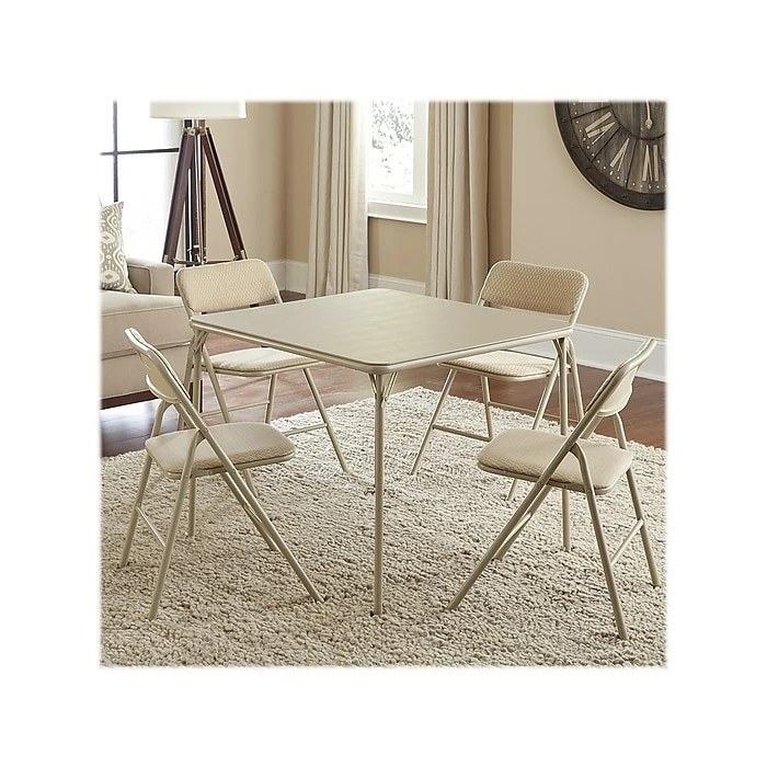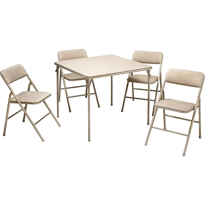 This Cosco five-piece folding table and chair set will make you ready for guests with an instant seating arrangement for four. The set will enhance any atmosphere, ranging from family gatherings, parties, or small space living if you’re looking for a set to promote that lifestyle. Comfortable for entertainment and compact for storage, this set features durable steel frames and a powder-coated finish. This tan-colored set comes with a sturdy 34″ square table with low-maintenance and easy-to-clean tabletop no matter the mess. The cross braces and tube-in-tube reinforced frame of the table guarantee a long-term investment you won’t be disappointed in as you use it as desired. The four chairs, built for maximum comfort and durability, are upholstered in an attractive fabric with padding on the seat and back so you can relax in style as you converse with family and friends. The table and chairs are made of a sturdy steel frame and rubber tips to protect your floors without fear of slipping while in use and fold neatly for noninvasive storage techniques when needed.
