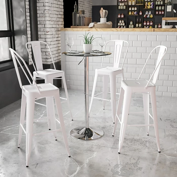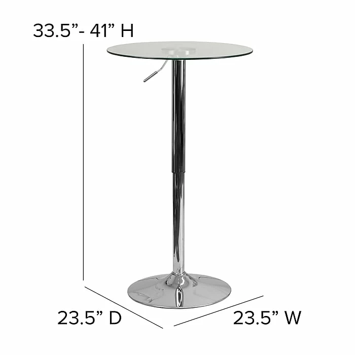 Create the perfect socializing and dining experience with this multifunctional table. This adjustable height pedestal table will make a spectacular statement piece in your venue. The height adjustable frame adjusts from counter to bar height with the handle located under the top. The adjusting height will make it your go to table for staging any occasion. The table has a narrow design so that there is plenty of room for larger tables to be setup. The round, chrome base is out of the way when guests ar e socializing and adds a contemporary chic design. The base is fitted with a protective plastic ring, made to prevent your floor from being scratched. This table can be used as a standalone option or with the use of similarly designed adjustable height barstools with chrome base.