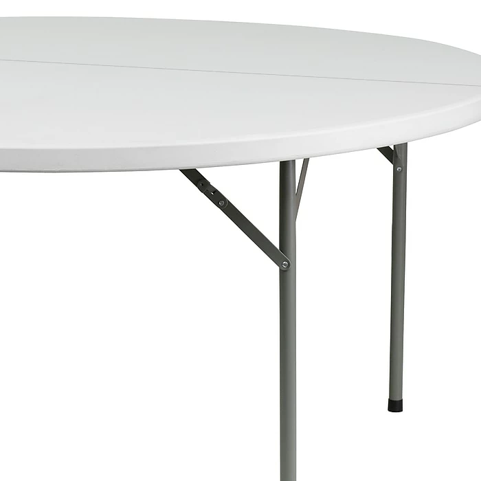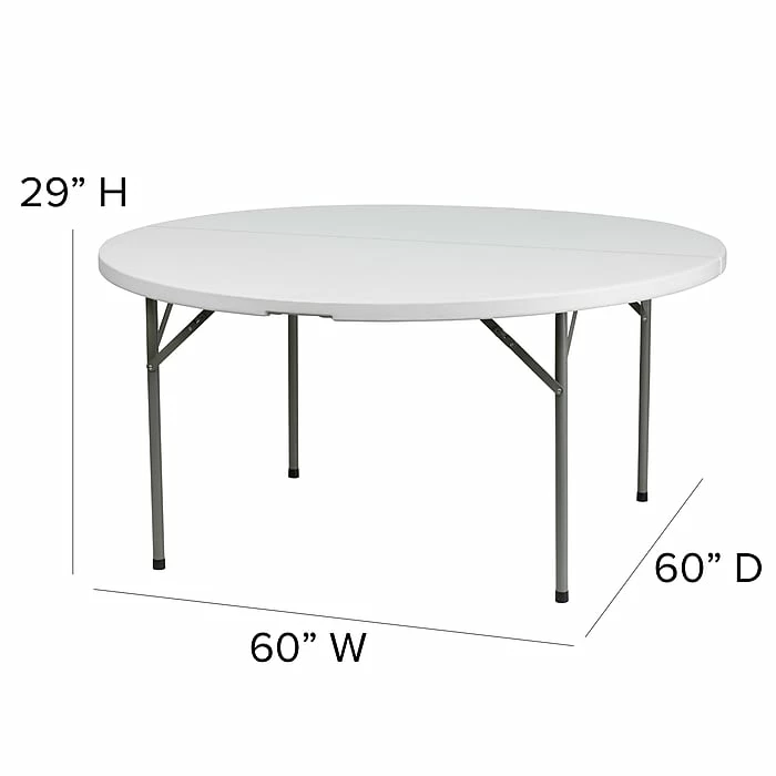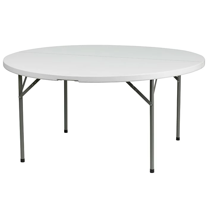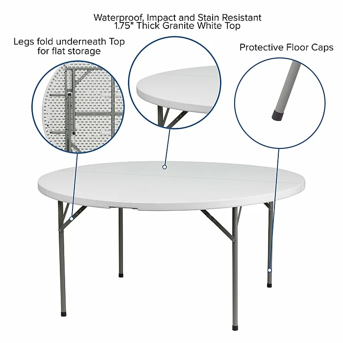 Add extra storage space to your office or home with the 60-inch Flash Furniture Commercial Table as it features an elegant and spacious design. Designed with a plastic tabletop with granite white, it is resistant to stains and is easy to clean. This plastic commercial table with its round design is ideal for areas with limited space and lends a trendy look to the decor of your room or office. Available as a single table, it features durable tabletop with blow-molded edges to protect the top from accidental damage.