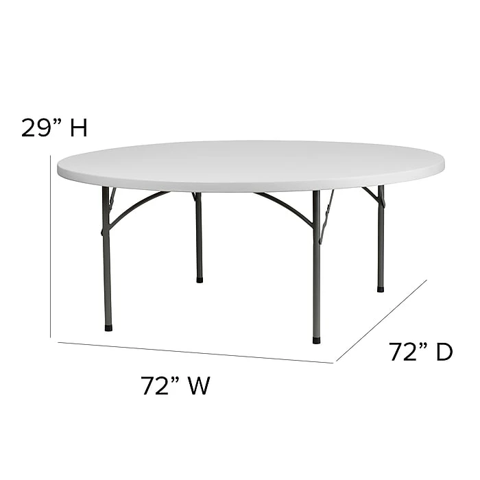 Perfect for indoor and outdoor setups, the 72-inch Flash Furniture Commercial Table is apt for your portable tabletop needs. Designed with a plastic tabletop with granite white, it is resistant to stains and is easy to clean. This plastic commercial table blends well with the existing decor and its round design fits comfortably in smaller spaces. Available as a single table, it features durable tabletop with blow-molded edges to protect the top from accidental damage.