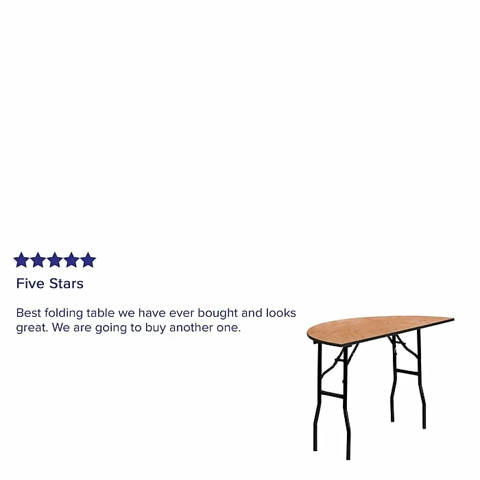 Designed for restaurant settings, the Flash Furniture Folding Banquet Table is a smart choice to expand your seating area. It features a wood tabletop with smooth plywood finish that makes it strong and useful for daily use. This wood folding and banquet table with its semi-circle design is ideal for areas with limited space and lends a trendy look to the decor of your room or office. Available as a single table, it features durable tabletop with black T-mold edges to protect the top from accidental damage.