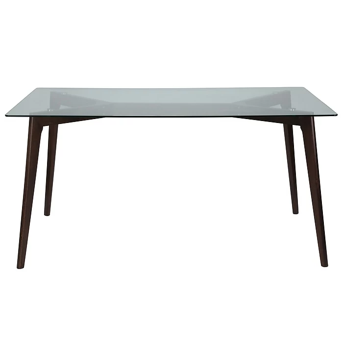 Wood and glass combination dining table. Glass top that sits atop a base made of solid beechwood. Protective floor glides.