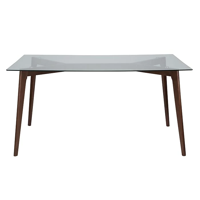 Wood and glass combination dining table. Glass top that sits atop a base made of solid beechwood. Protective floor glides.