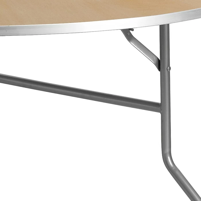 Designed for restaurant settings, the 60-inch Flash Furniture Folding Banquet Table is a smart choice to expand your seating area. It features a wood tabletop with smooth quadruple coated polyurethane varnish that makes it strong and useful for daily use. This wood folding banquet table with its round design is ideal for areas with limited space and lends a trendy look to the decor of your room or office. Available as a single table, it features durable tabletop with aluminum edges to protect the top from accidental damage.