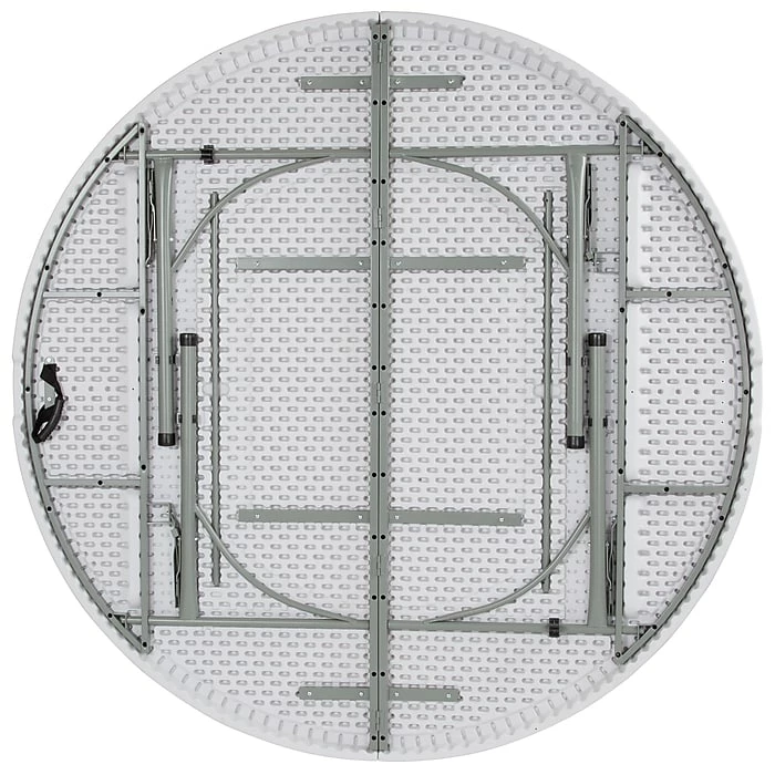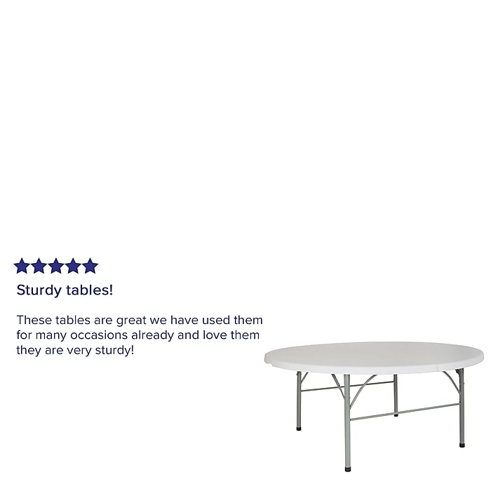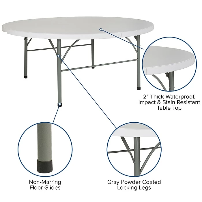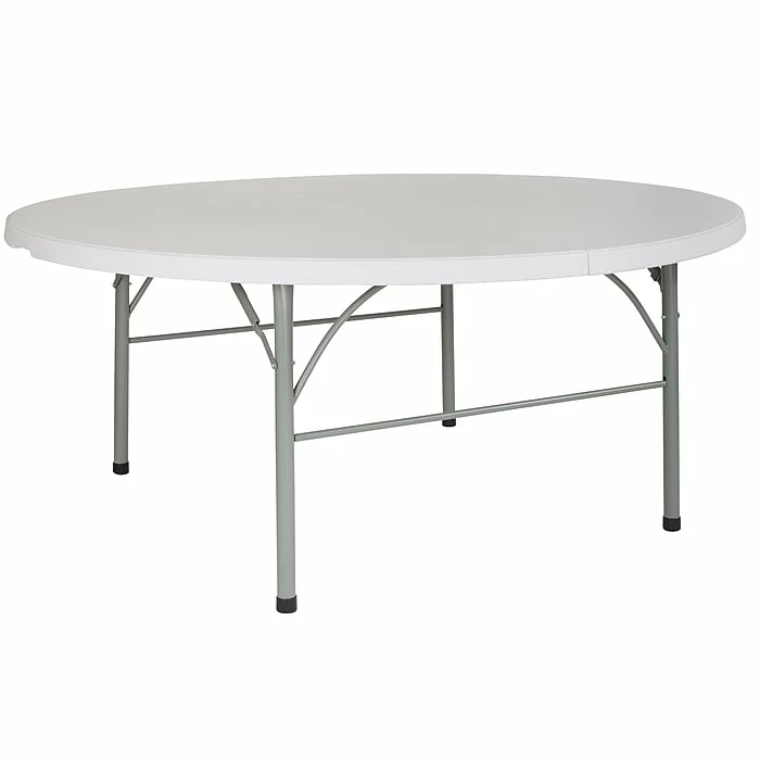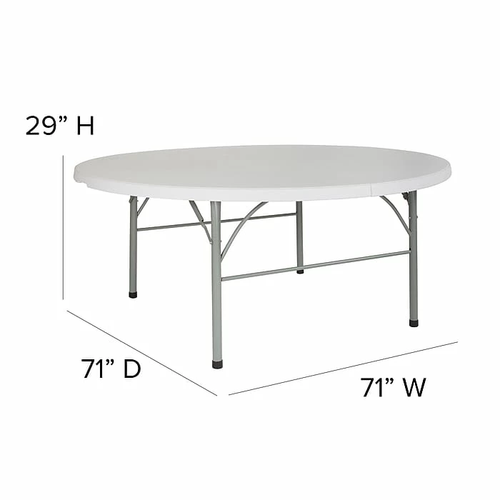 Bring this 72-inch granite white table to indoor and outdoor events so you can create space for up to eight adults with a minimum of fuss. Its locking legs prevent mishaps, and the floor caps protect surfaces from snags and scratches. This Flash Furniture plastic table has a bifold design and carrying handle making it easy to assemble, transport and pack up.