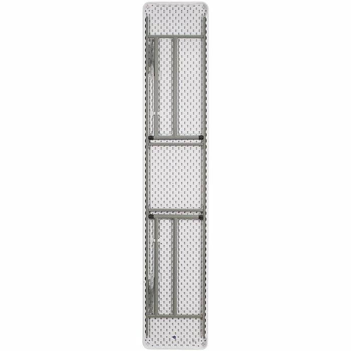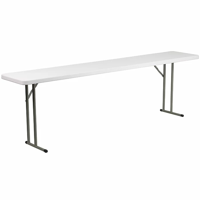 Create a conference space in minutes with this 8-foot folding table. Its 18-inch width lets you position rows closer together while still providing a flat spot for laptops, notepads or beverages. Locking legs and protective floor caps keep it stable, and the durable granite white top resists stains. This Flash Furniture folding table sets up quickly indoors or out and has ample room for four adults.