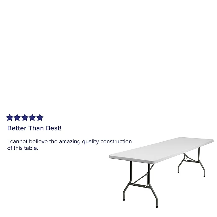 Meet seating needs for up to 10 adults with this commercial-grade table. Its protective floor caps guard against damage to wooden floors or carpet, and the 1.75-inch granite white top is waterproof and stain-resistant. Capable of supporting up to 661 pounds, this 8-foot Flash Furniture table can easily hold heavy platters of food, large centerpieces and vendor displays.