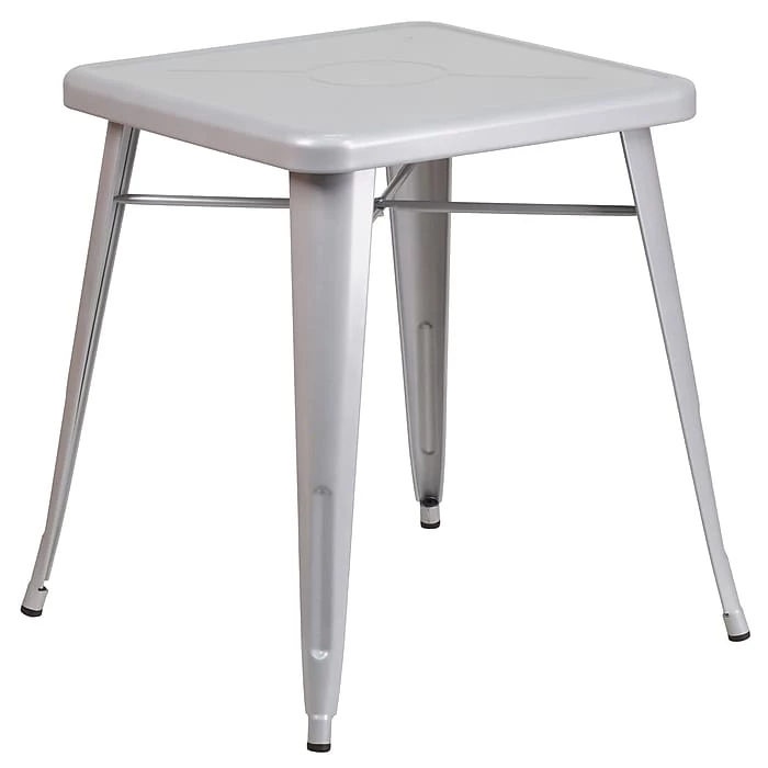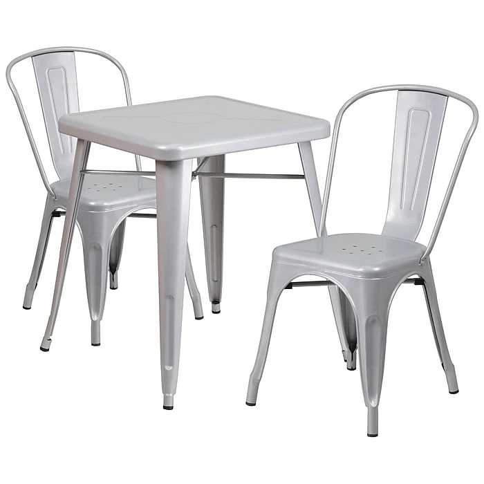 Complete your dining room, restaurant or patio with this chic table and chair set. This colorful set will add a retro-modern look to your home or eatery. The table top features an engraved designer print, stabilizing cross brace and protective rubber fl oor glides. The lightweight stack chair features plastic caps that prevent the finish from scratching while being stacked. This 3 piece table set is designed for indoor and outdoor settings. For longevity, care should be taken to protect from long perio ds of wet weather. The possibilities are endless with the multitude of environments in which you can use this table, for both commercial and residential spaces.