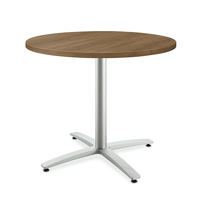 This 36″D round seated height table attracts people to lesser populated spaces like nooks, hallways and everywhere in Between. The top is covered in Shaker Cherry scratch-, spill- and stain-resistant laminate with Shaker Cherry edgeband that will look great for years to come. The cast Aluminum X-base with Textured Silver finish matches virtually any surrounding aesthetic and provides a sturdy foundation.