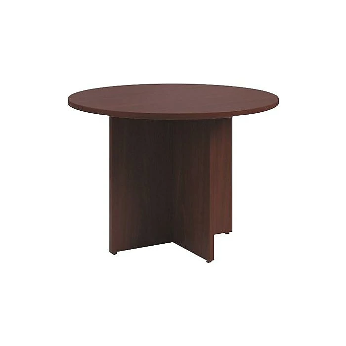 The HON Preside conference table is round and has a flat edge profile. It features a panel X-base, 42″ diameter, and mahogany finish.
