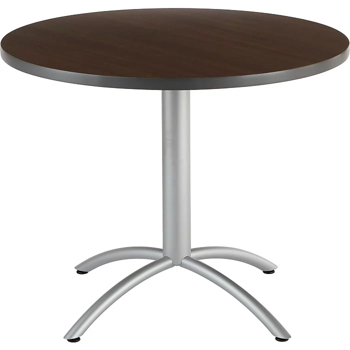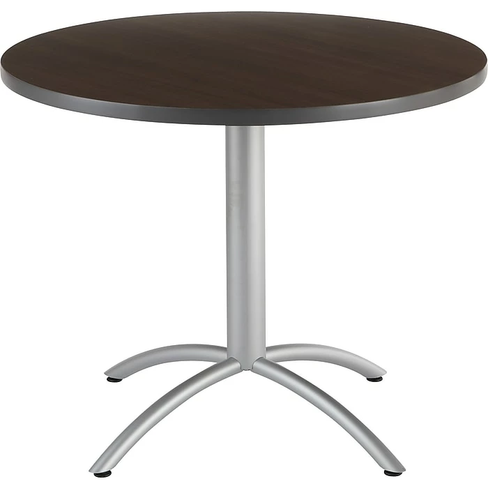 Iceberg® CafeWorks Round cafe table in walnut color features melamine laminate surface for durability and aesthetic look. Table of size 36″ has sturdy steel base for added strength.