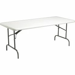 Iceberg 8′ Heavy-duty commercial resin folding banquet table in platinum granite finish has 2″ thick blow molded high impact polyethylene scratch/stain resistant top. Table measures 29″ x 30″ x 96″ and holds up to 1200 lbs weight capacity.