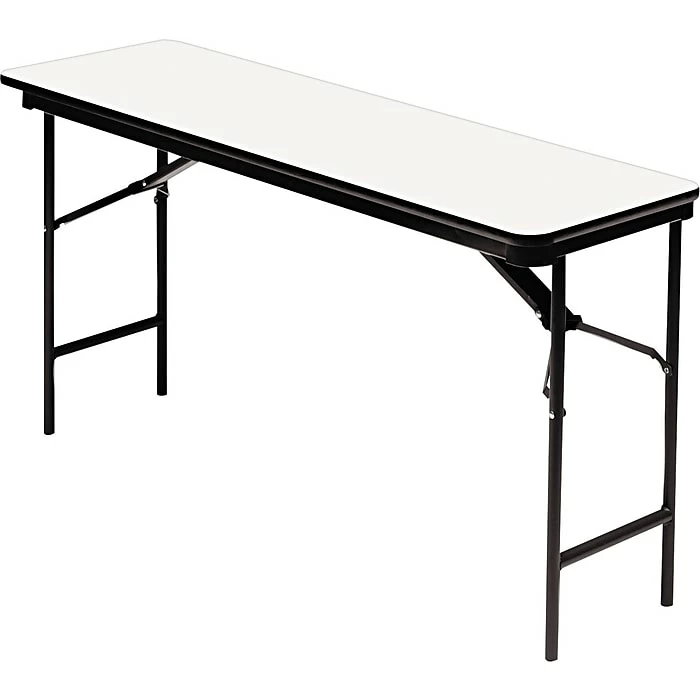 - Folding tables feature a wear-resistant, 3/4″ top surface; laminated melamine over particle board with a melamine-sealed underside and bull-nose vinyl T-mold edging