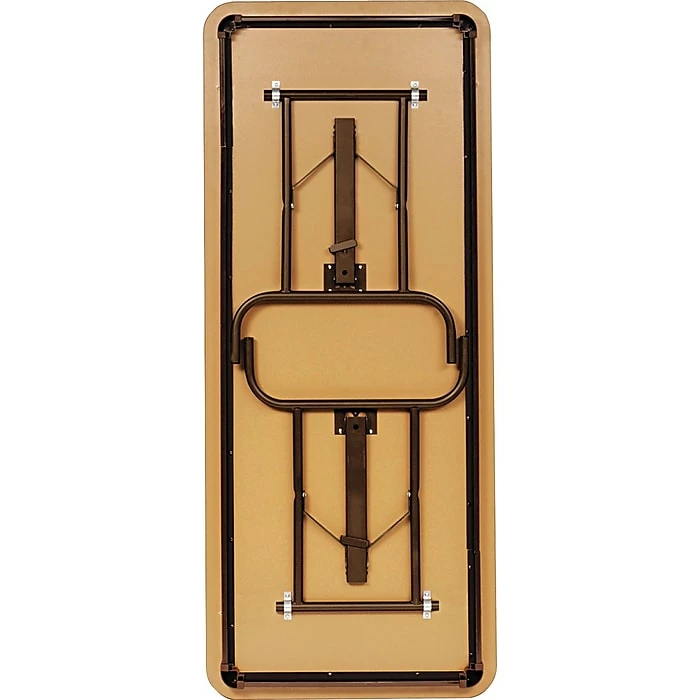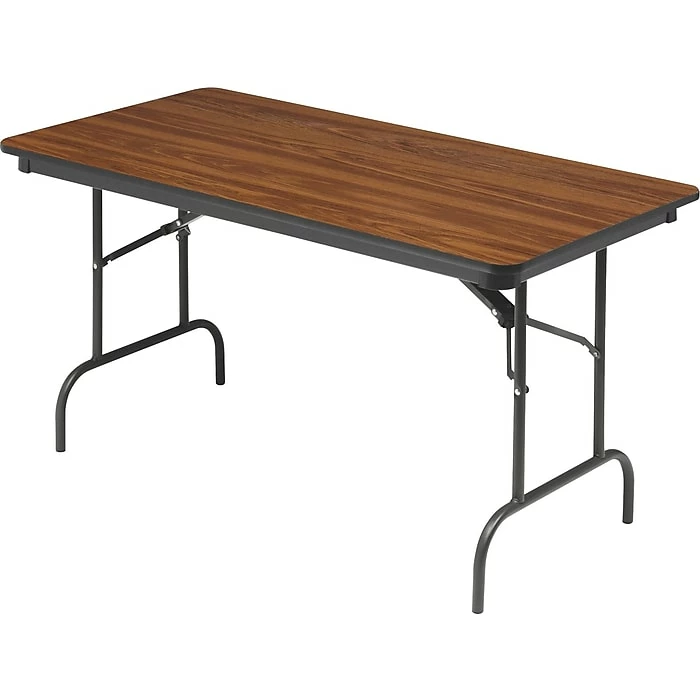 - Folding tables feature a wear-resistant, 3/4″ top surface; laminated melamine over particle board with a melamine-sealed underside and bull-nose vinyl T-mold edging