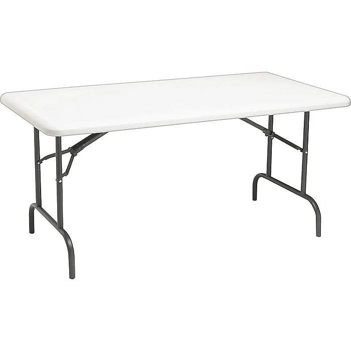 Iceberg 5′ Heavy-duty commercial resin folding banquet table in platinum granite finish has 2″ thick blow molded high impact polyethylene scratch/stain resistant top. Table measures 29″ x 30″ x 60″ and holds up to 1200 lbs. weight capacity.