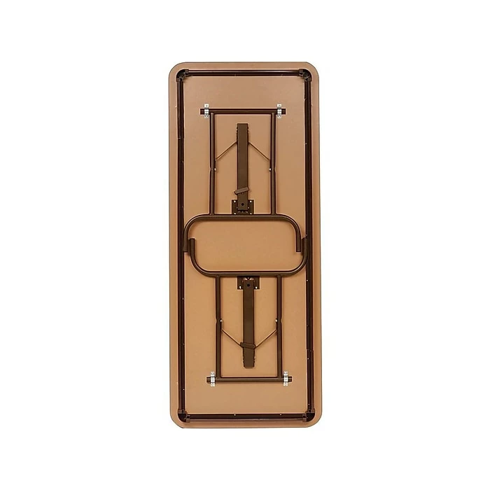 - Mahogany folding table is made of melamine and features heavy gauge steel base