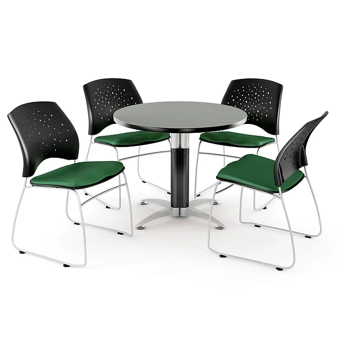 OFMâ„¢ Multi-purpose round gray nebula 42″ table with 4 chairs in forest green color package has 1 1/4″ thick high-pressure laminate top with honeycomb core. Package includes 4 chairs which has extra thick curved backs with built-in lumbar support.