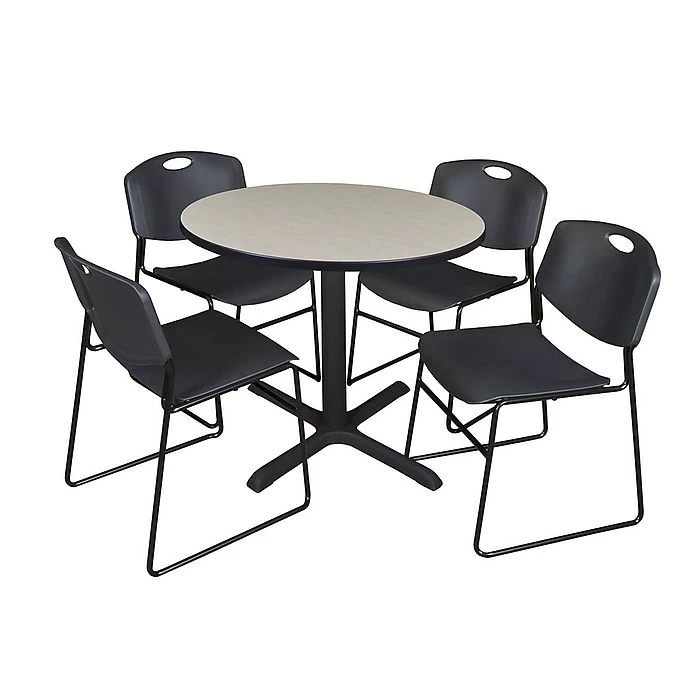 Regency black 36-inch round shape laminate table with 4 chairs can hold weight of up to 125 lbs. and requires easy assembling. The maple finish provides a natural look while still adding a sense of style to it.