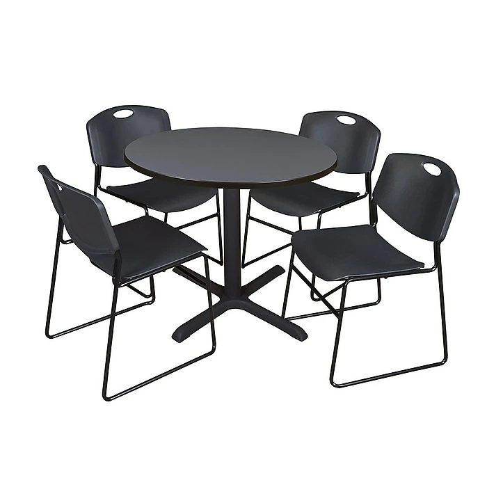 Regency gray & black laminate round table with 4 Zeng stack chairs features a sturdy black tubular steel construction with hidden glides for height adjustment. It has a thermally fused melamine top that is resistant to burns and stains.