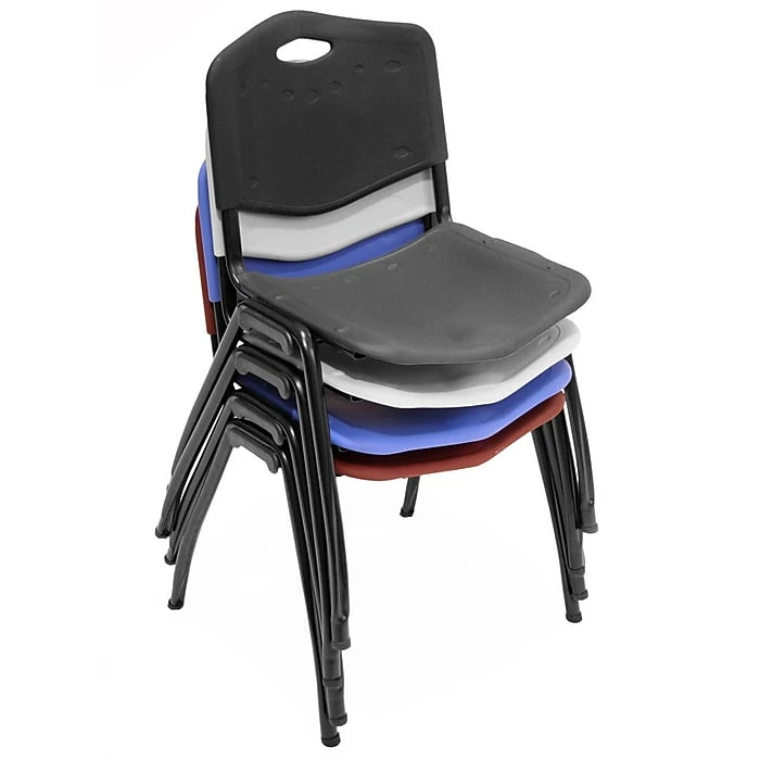 Give everyone more room with Kee tables. Kee post legs come four to a set and include adjustable leveling glides so you have a steady table with no wobble. This versatile table and chair set includes one 72-inch long Kee training table with black post legs and two Burgundy “M” Stack Chairs. The table is constructed of a thermal fused melamine Mahogany laminate tabletop that is 1-inch thick and finished with a black T-Mold edge band. Laminates are scratch, stain and scald resistant and wipe clean easily. Rounded corners make the table safer for everyone. A sleek alternative to pedestal style bases, this set of post legs comes in a classic black to match any decor. The legs are constructed of tubular steel with adjustable glides on the bottom of the base. The sturdy, lightweight “M” stack chair by Regency offers durability, style and value. Its black metal frame and contoured plastic seat and back are strong and easy to clean. This versatile stack chair easily stores away in stacks of 12 and features a built in handle for easy mobility. All Regency chairs are backed by a 5-year limited manufacturer’s warranty on chair bases and frames and a 2-year limited manufacturer’s warranty on chair mechanisms and upholstery. Kee tables are backed by a 10-year limited manufacturer’s warranty.