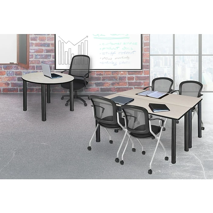 Give everyone more room with Kee tables. Kee post legs come four to a set and include adjustable leveling glides so you have a steady table with no wobble. This 60-inch long training table assembles in a snap with just a few screws. The table is constructed of a thermal fused melamine Maple laminate tabletop that is 1-inch thick and finished with a black T-Mold edge band. Laminates are scratch, stain and scald resistant and wipe clean easily. Rounded corners make the table safer for everyone. A sleek alternative to pedestal style bases, this set of post legs comes in a classic black to match any decor. The legs are constructed of tubular steel with adjustable glides on the bottom of the base. Kee tables are backed by a 10-year limited manufacturer’s warranty.