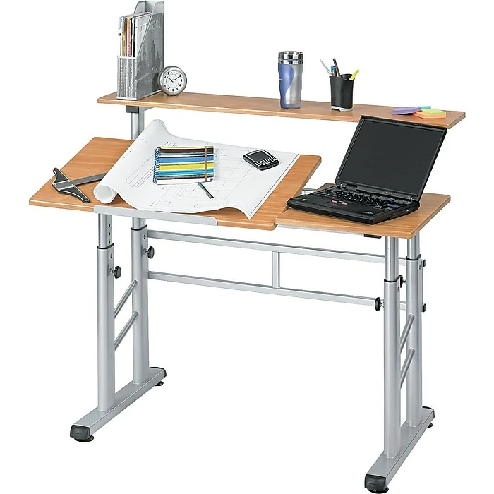 Safco® Height-Adjustable split level workstation in medium oak color measures 37 1/4″ x 47 1/4″ x 29 1/2″ and features rectangular shape. Workstation comes in 3 in 1 design that functions as a split level drafting table, shelving area and desk.