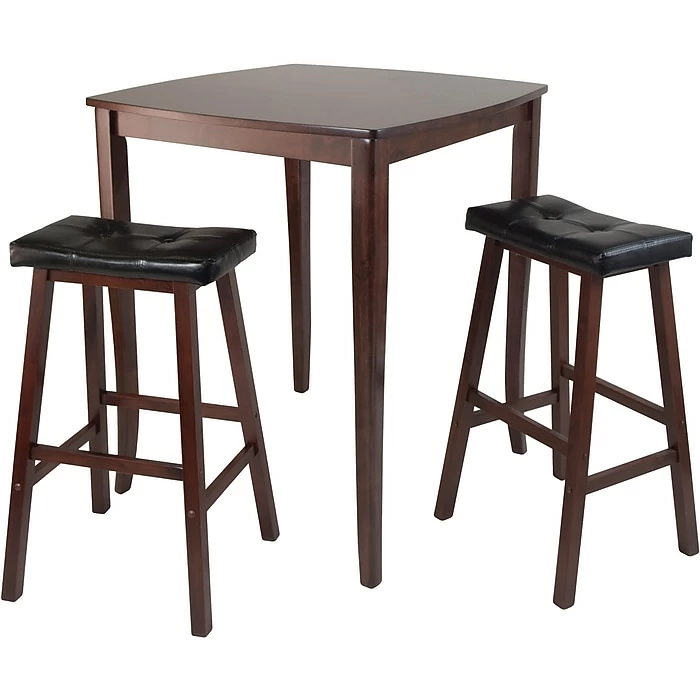 Winsome Inglewood 3 piece high/pub dining table features natural antique walnut finished durable solid wood curved table top with flare legs and saddle stool seat padded by black PVC.This set is a perfect choice for kitchen and enhances room decor.